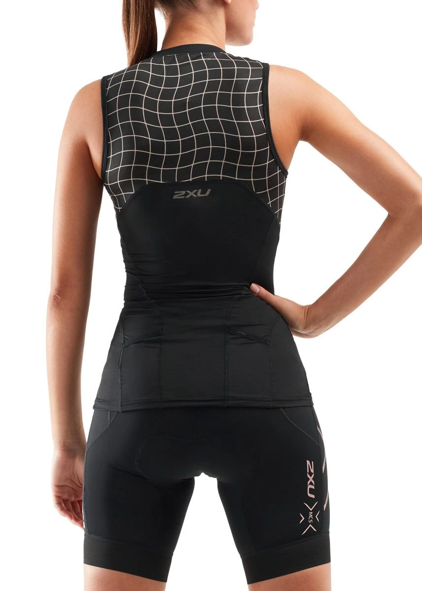 Completely redesigned in accordance with 2XUâs latest RMIT University research, the 2XU Women’s Compression Tri Singlet in black and gold promises superior ventilation and power.