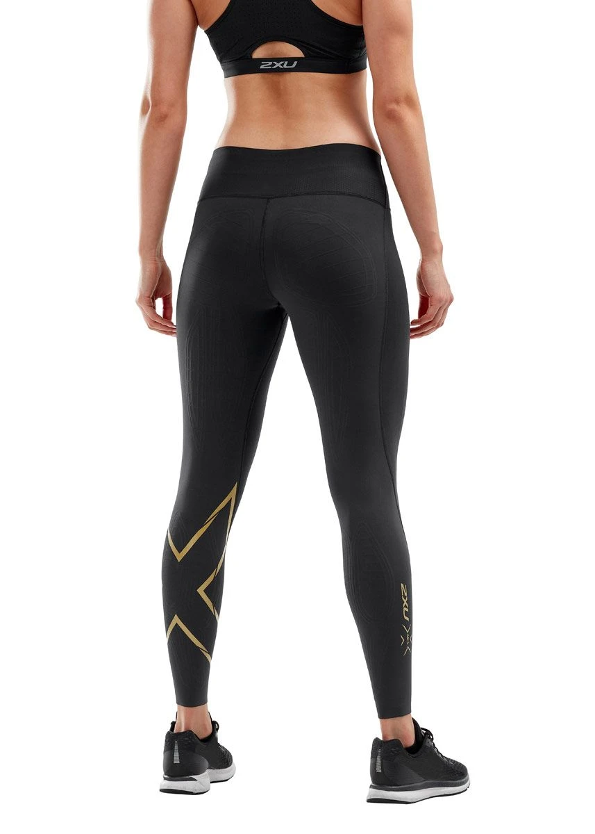 The 2XU MCS Cross Training Mid-Rise Compression Tights in black and gold are designed to support key muscles under impact from high-intensity interval training. Cross training involves a range of dynamic movements that are physically demanding, these tights provide anatomically mapped muscle support for reduced muscle fatigue, damage and reduced risk of injury.