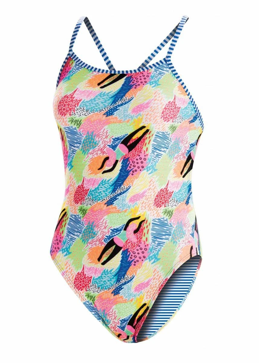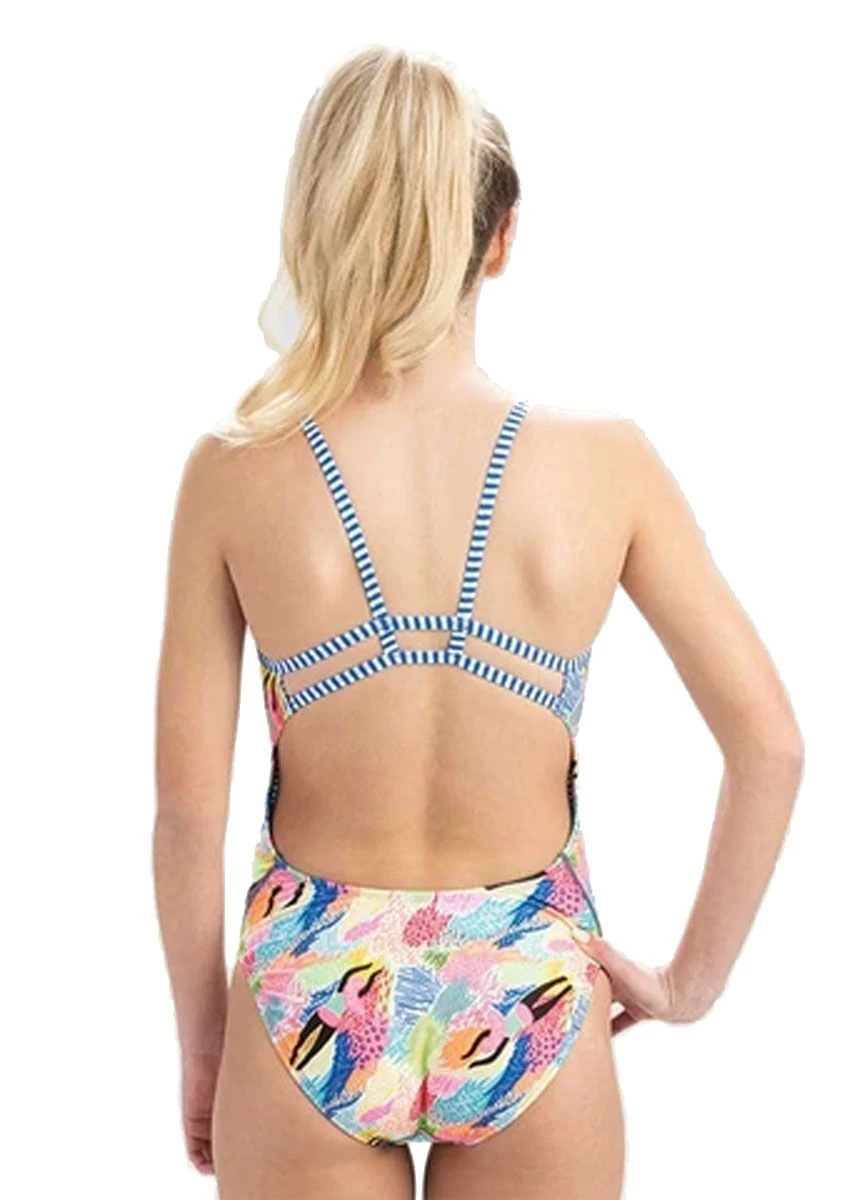 Train in the Girl’s Dive Deep Double Strap Keyhole Back Swimsuit which is unique and eye-catching from Uglies. Printed with a vibrant multicoloured pattern, this swimsuit stands out and looks beautiful both in and out of the water.